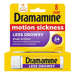 Dramamine Motion Sickness Relief Less Drowsey Formula, 8 Count Less Drowsy relieves motion sickness symptoms with less drowsiness up to 24 hours